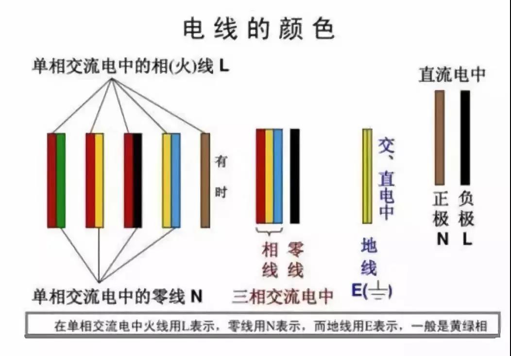 三相交流电路 A相为黄色,B相为绿色,C相为红色,零线和中性线为蓝色,保护接地线为黄绿双色,而单相电路中,火线为红色,零线为蓝色,装修过的朋友多这个应该都有简单的认知。直流电路,正极是棕色,负极是蓝色,接地线也是蓝色。